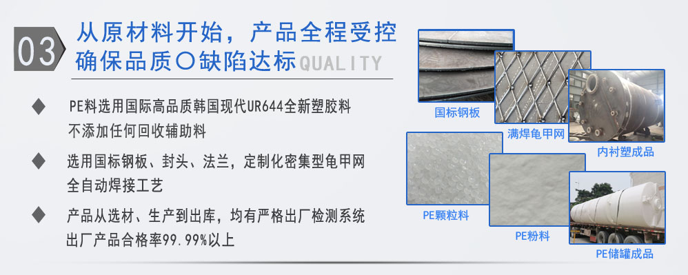 公司有鋼襯塑PE/PO、PE全塑、碳鋼、不銹鋼四大系列100多個品種,專注于常壓儲存容器生產,其產品包括鋼襯塑儲罐管口一體成型PE儲罐碳鋼儲罐、不銹鋼儲罐、反應釜、攪拌罐、離子交換柱、鋼襯PE/PO儲罐、塑料儲罐鹽酸儲罐、硫酸儲罐等等。更大限度滿足廣大客戶的各種需求,同時可以根據客戶的需要加工定制各種防腐設備。